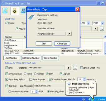 PhoneTray Free es un contestador automático para el PC. Además de tomar nota de las llamadas recibidas, PhoneTray Free dispone de contestador automático, lista negra de números, tonos personalizados y alertas con síntesis de voz.